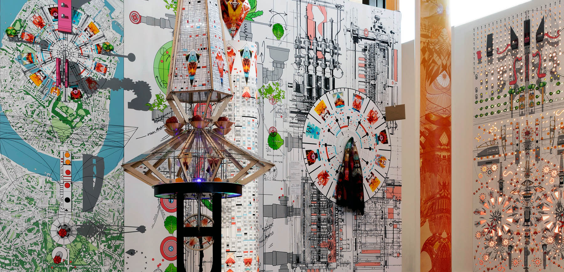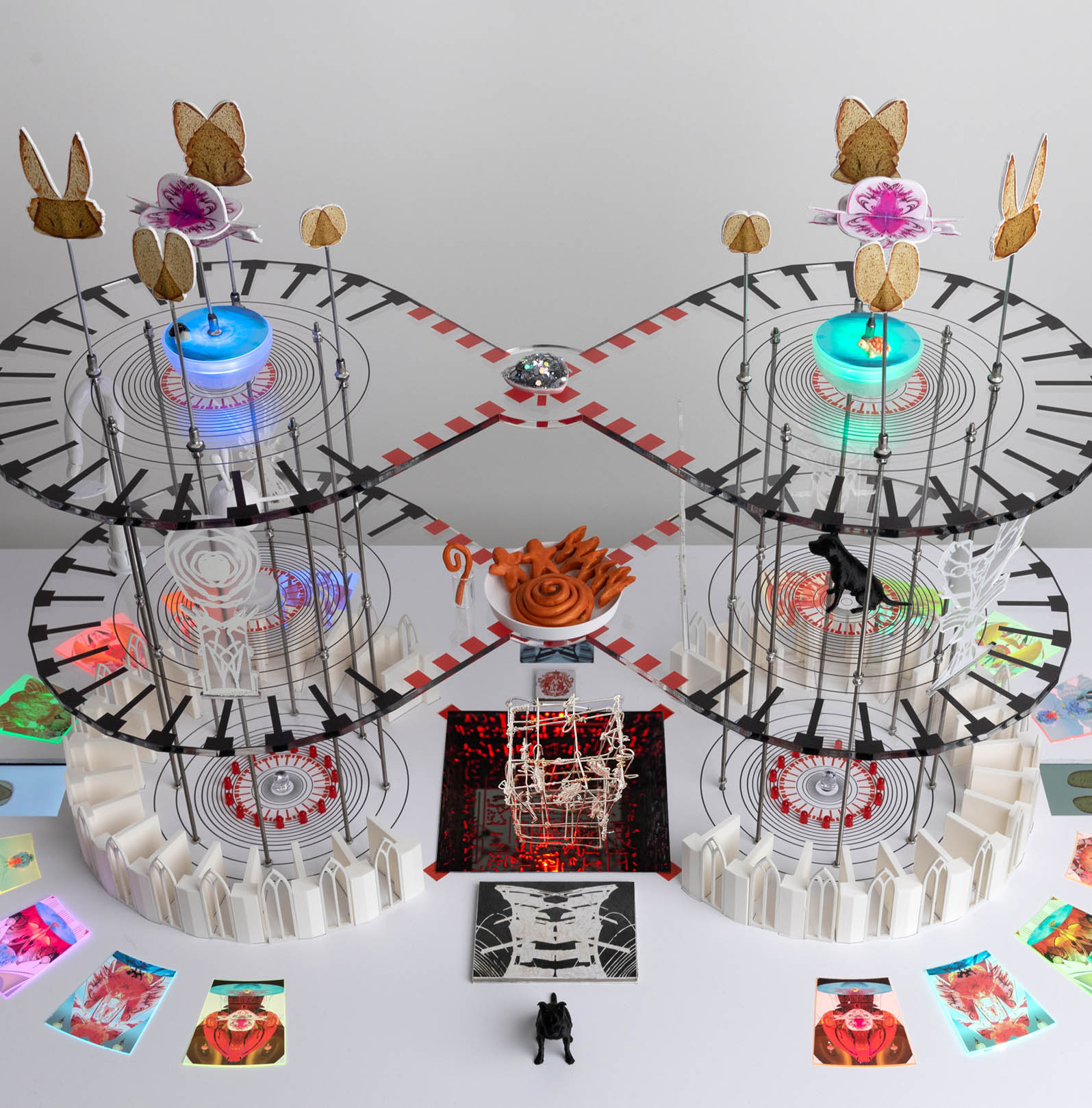 Mixed media sculpture incorporating laser-cut birch plywood, UV-printed laser-cut acrylic and vinyl, stainless steel fixings, LED lighting, ceramic, found objects, PLA, silver-plated wire, digital video (looped MP4) displayed on 4-inch LCD screens via embedded microcomputers, house dust and glitter, mounted on MDF plinth.