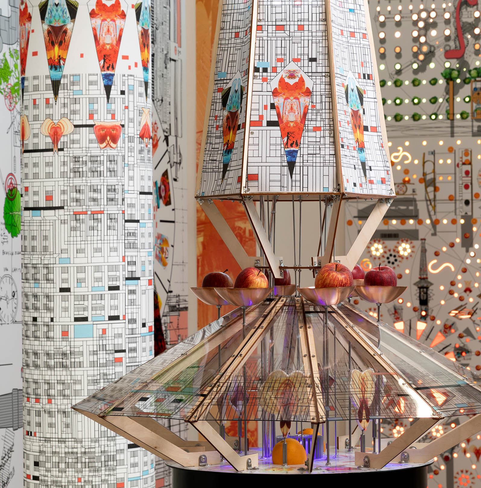 Apples, oranges, aluminium, stainless steel, mild steel, European birch plywood, MDF, porcelain, glass, cotton, UV-printed polypropylene, UV-printed acrylic, PLA, PVC, cardboard, 6 × 4-inch LCD screens looping MP4 videos via embedded microcomputers, LED lighting, neon lighting.